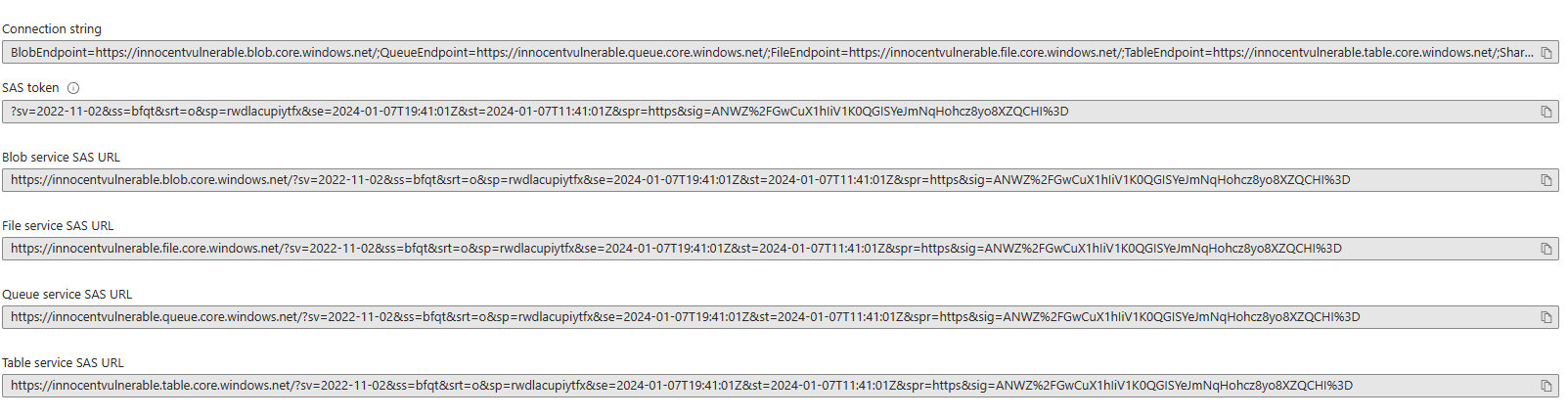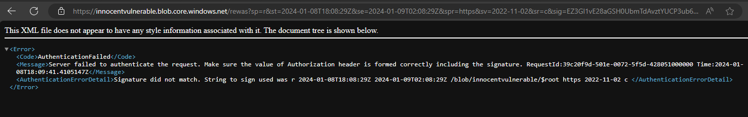 <figure><img src="https://3206293970-files.gitbook.io/~/files/v0/b/gitbook-x-prod.appspot.com/o/spaces%2F-M5Atwh7gE2wshwU38KX%2Fuploads%2FzWqe1cdplPLFcI8Qj5bp%2Fimage.png?alt=media&#x26;token=8fc58451-37b1-4906-ba9a-a3458440e2c1" alt=""><figcaption><p>Storage account without SAS</p></figcaption></figure>