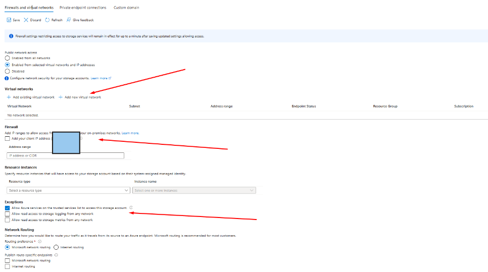 * <mark style="color:blue;">**Resource specific restrictions:**</mark> Storage account can be exposed only to specific resources (eg. virtual machines). This is very useful where you need resources inside Azure only need to access the storage account. The restriction can also be applied to resources in the same resource group/subscription/tenant.