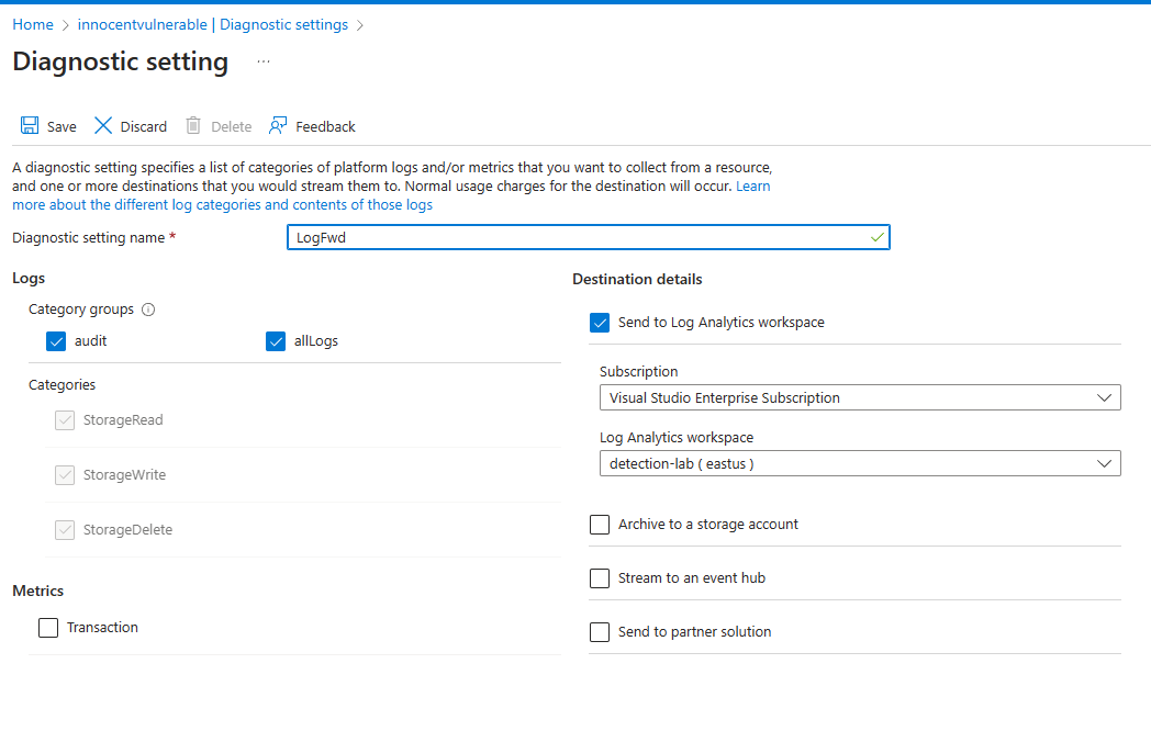 For the sake of this blog, all the logs are being forwarded to Log analytics workspace. However, the same can be forwarded to a storage account and subsequently forwarded to an SIEM. However, the detection logic would still remain the same except the query.&#x20;