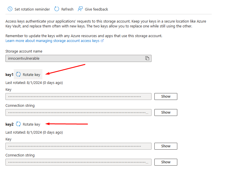 * <mark style="color:blue;">**Rotate Key to cause DoS:**</mark> An adversary can simply rotate keys that are used to create SAS. Any downstream applications leveraging these keys to create signatures will break causing a potential denial of service. The rotation of account key would also remediate all the SAS tokens that are generated with that key. The reference for the action is below.